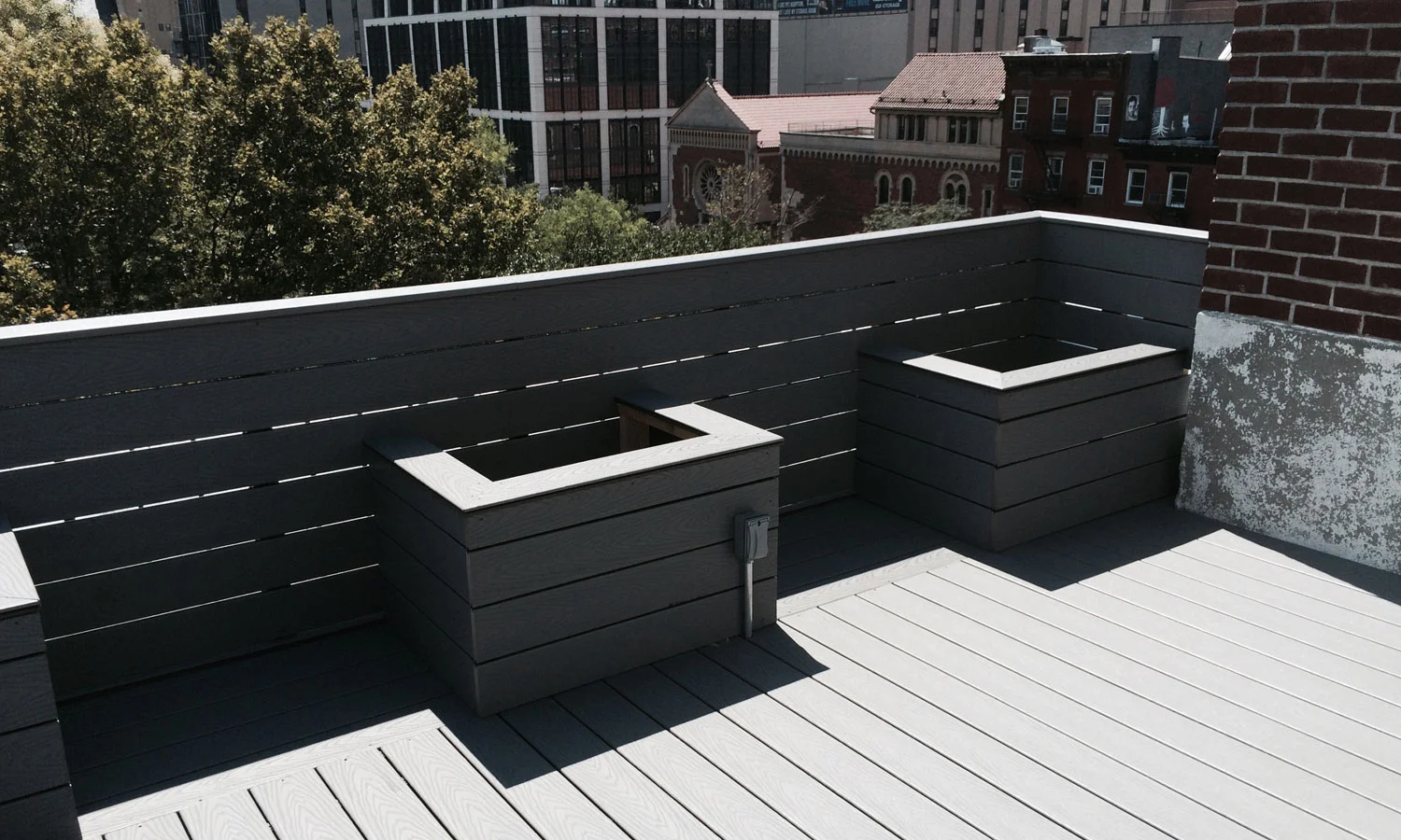 Six months to a year after the major renovation was completed the clients came to the team* requesting a design for a rooftop deck. With its breathtaking views of Chelsea and the High Line a minimal deck, floating above the roof membrane, made of composite deck material was designed; with integrated seating, storage, and planter boxes.